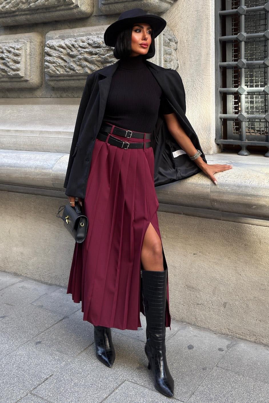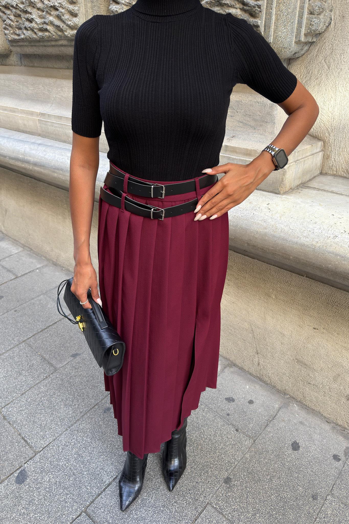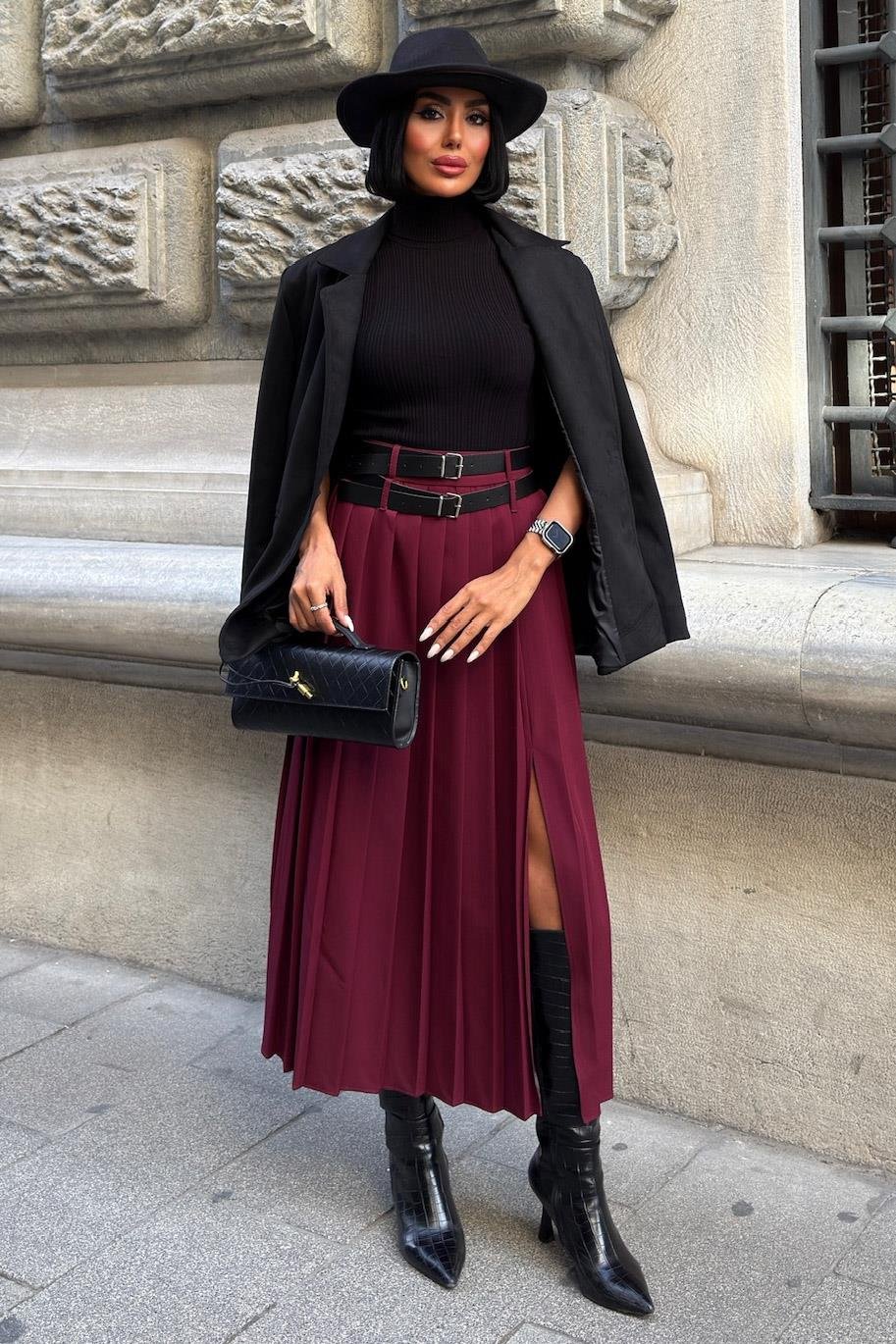Çift Kemer Detaylı ve Yırtmaçlı Pileli Etek 4055 (S6K4055)