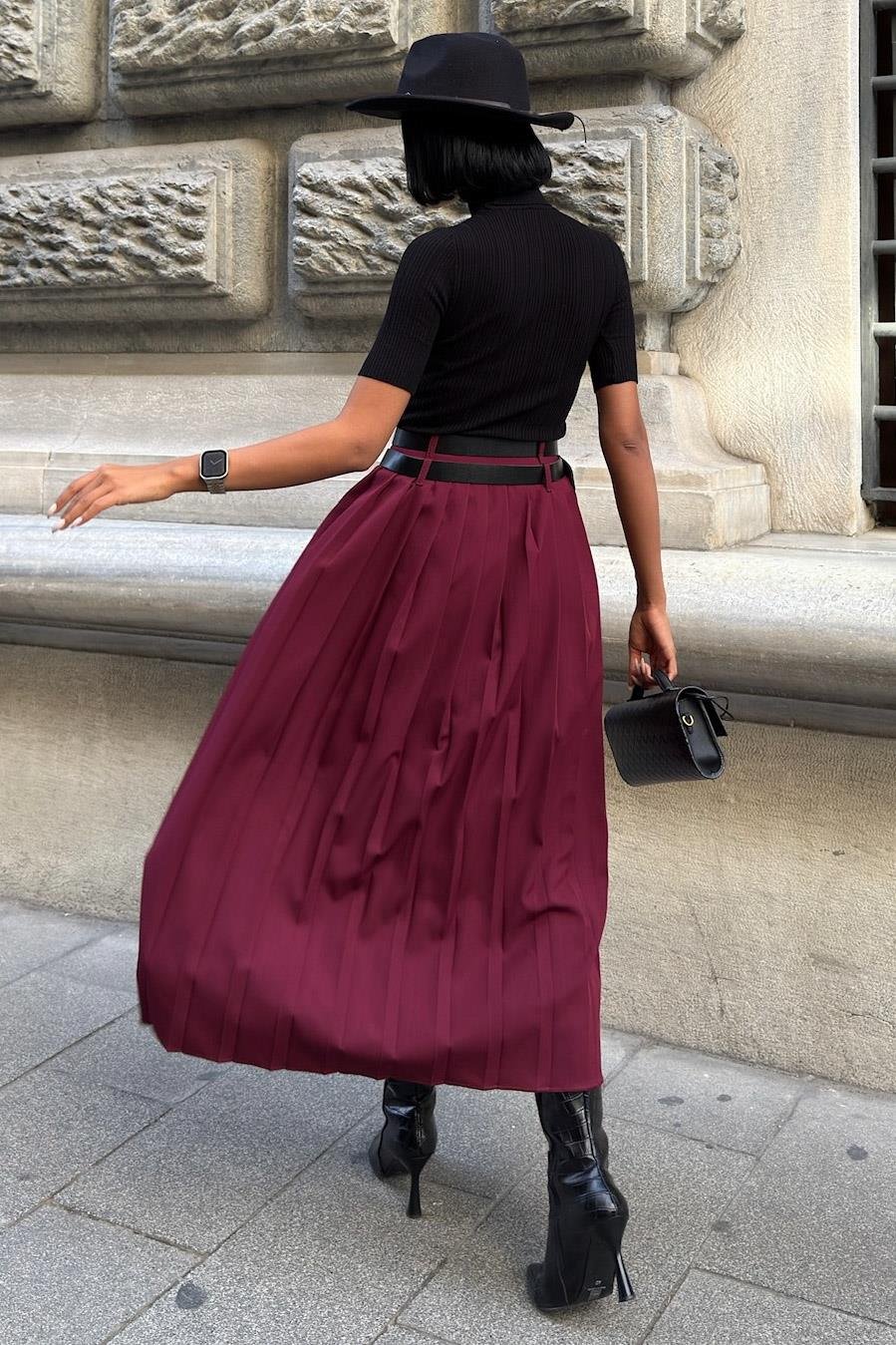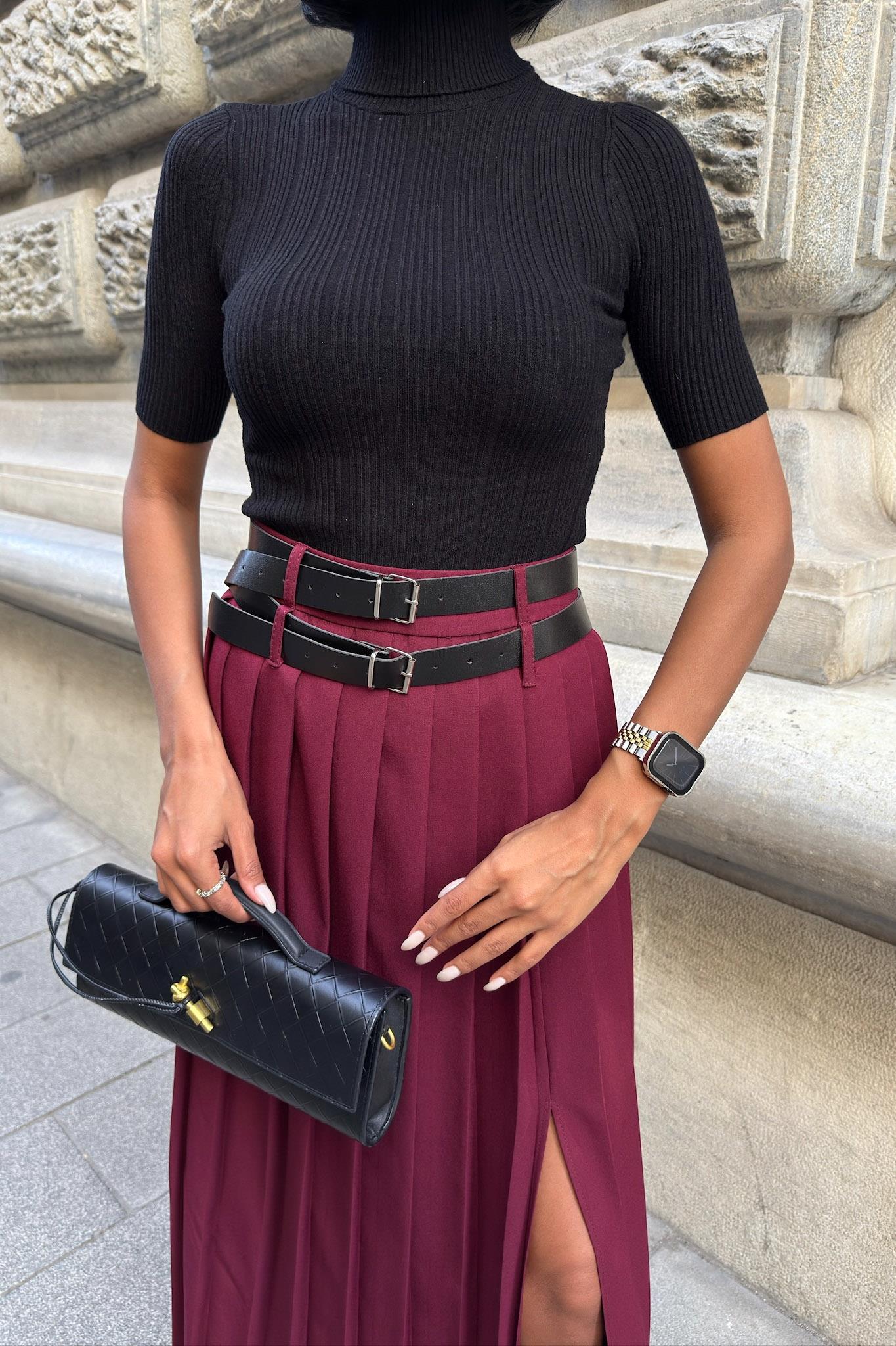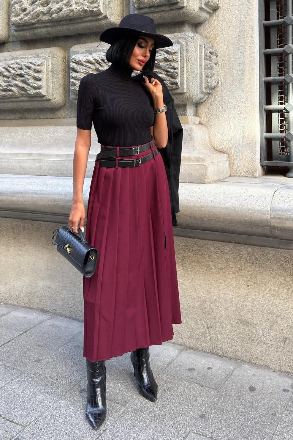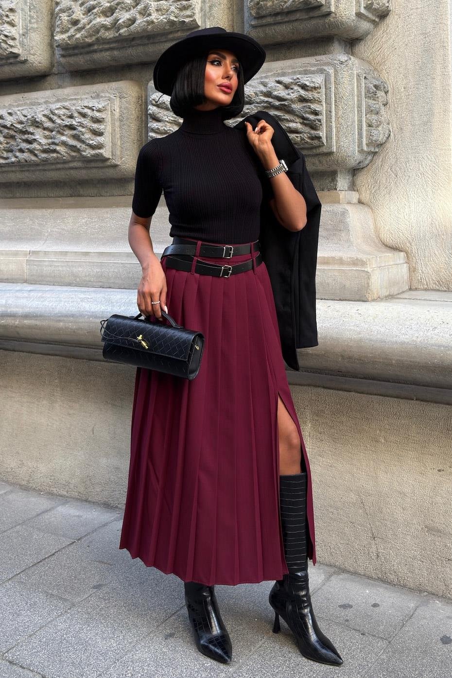 Çift Kemer Detaylı ve Yırtmaçlı Pileli Etek 4055 (S6K4055)