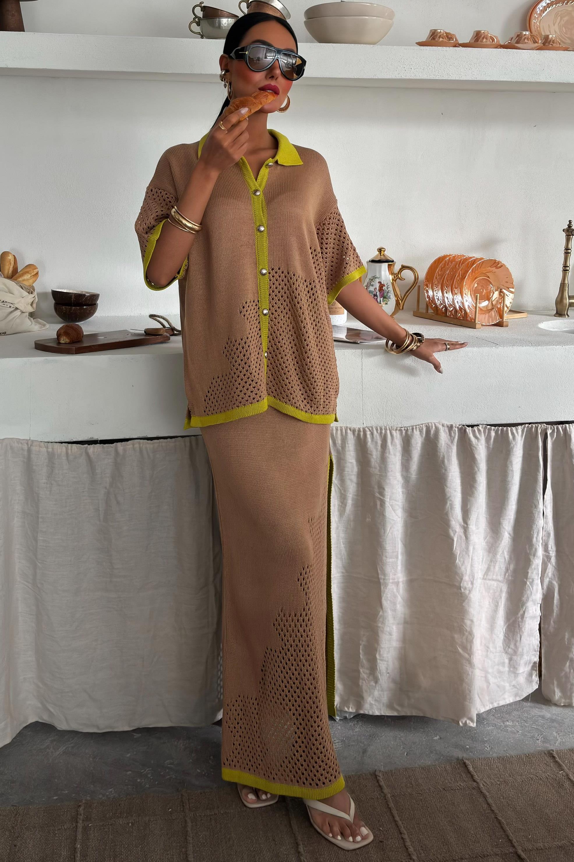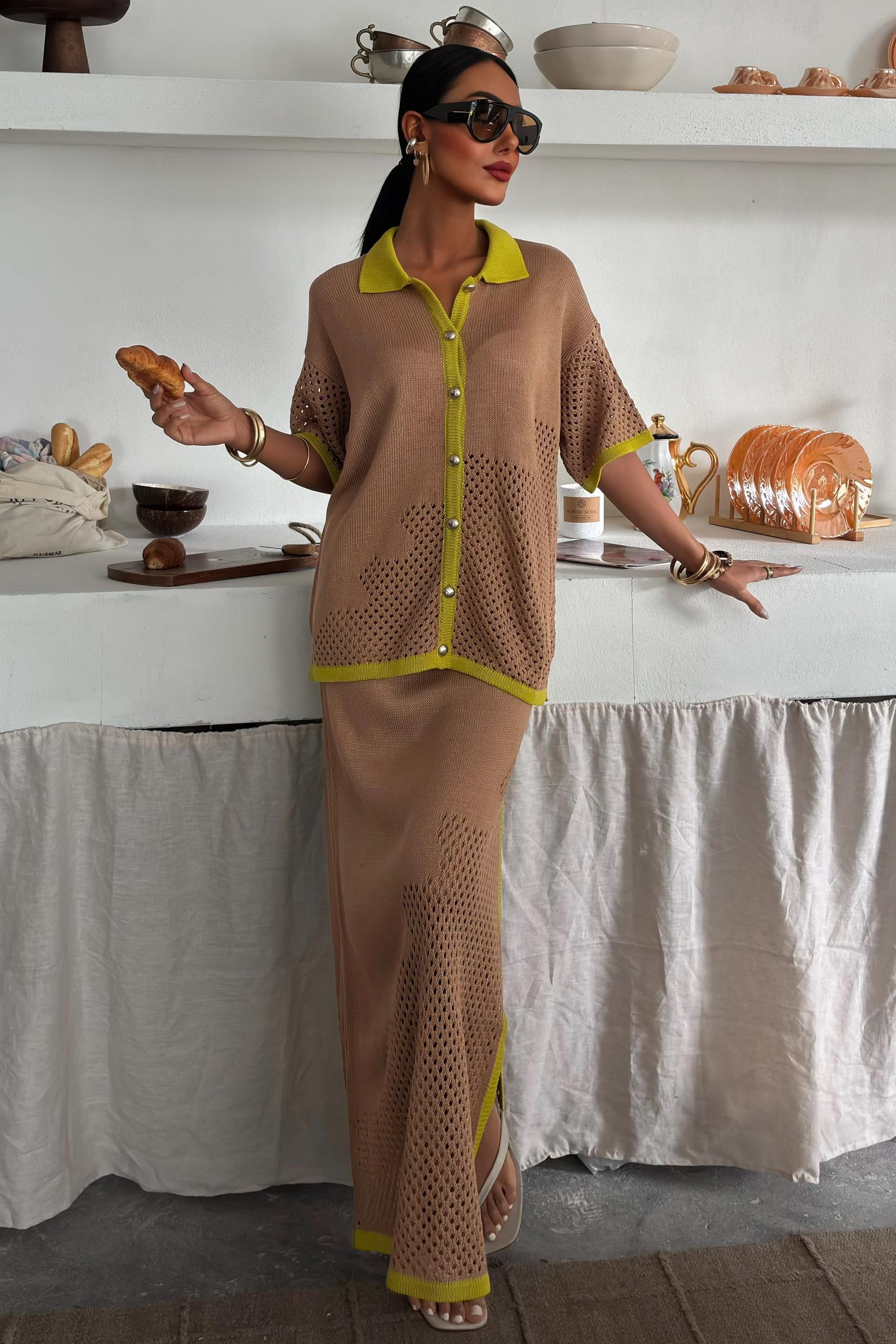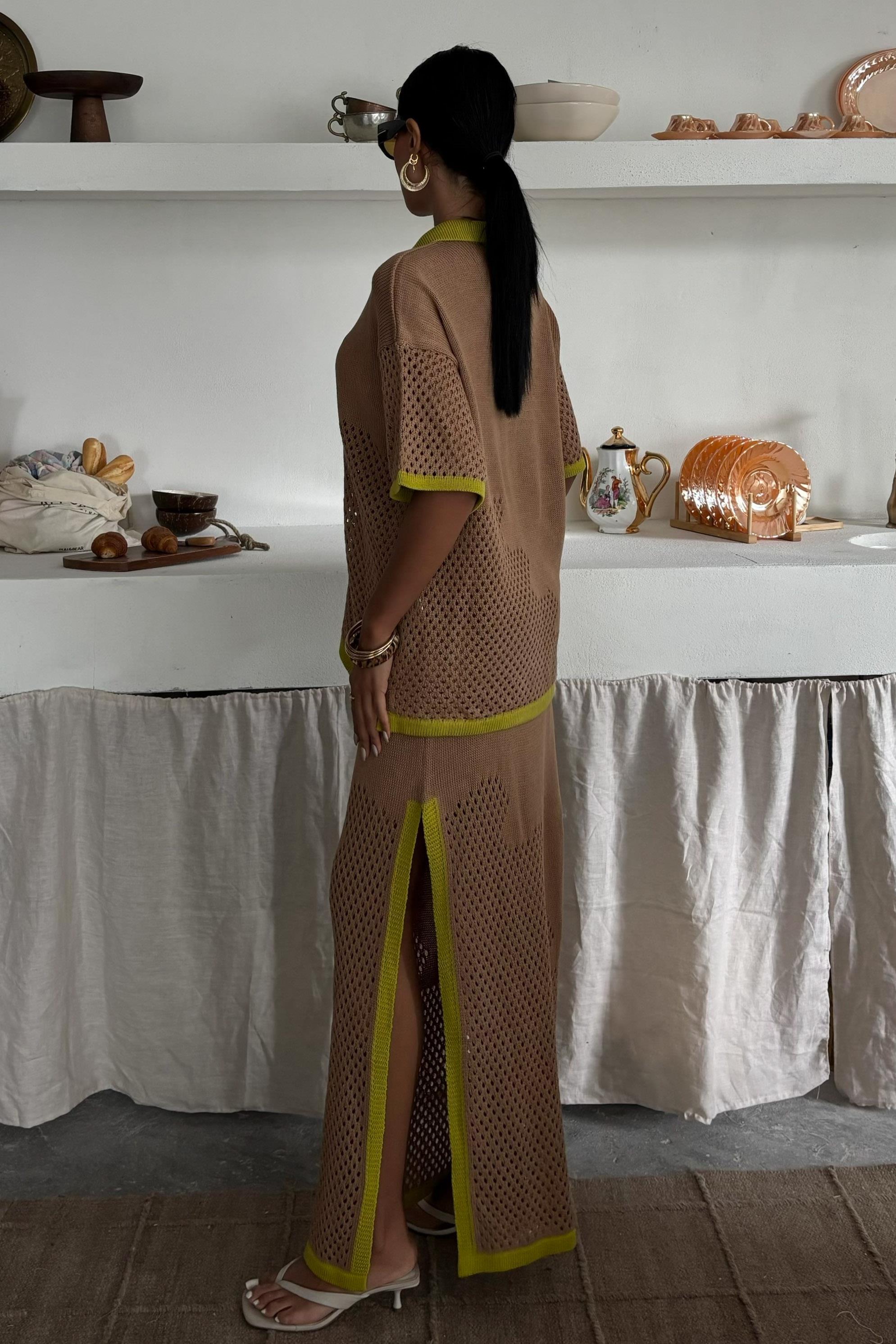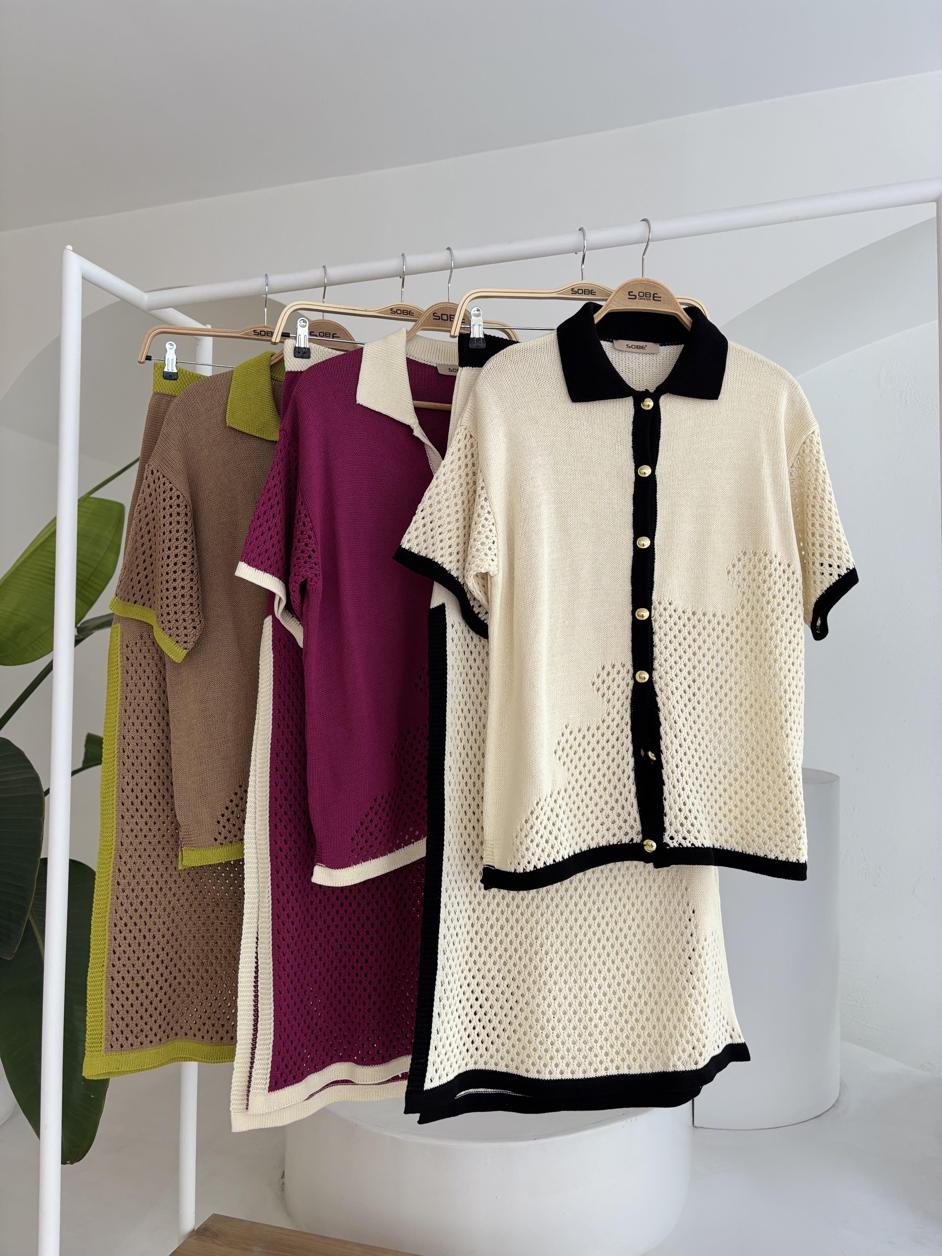 Stripe Detailed Polo Collar Openwork Suit 10137 (S5Y10137)