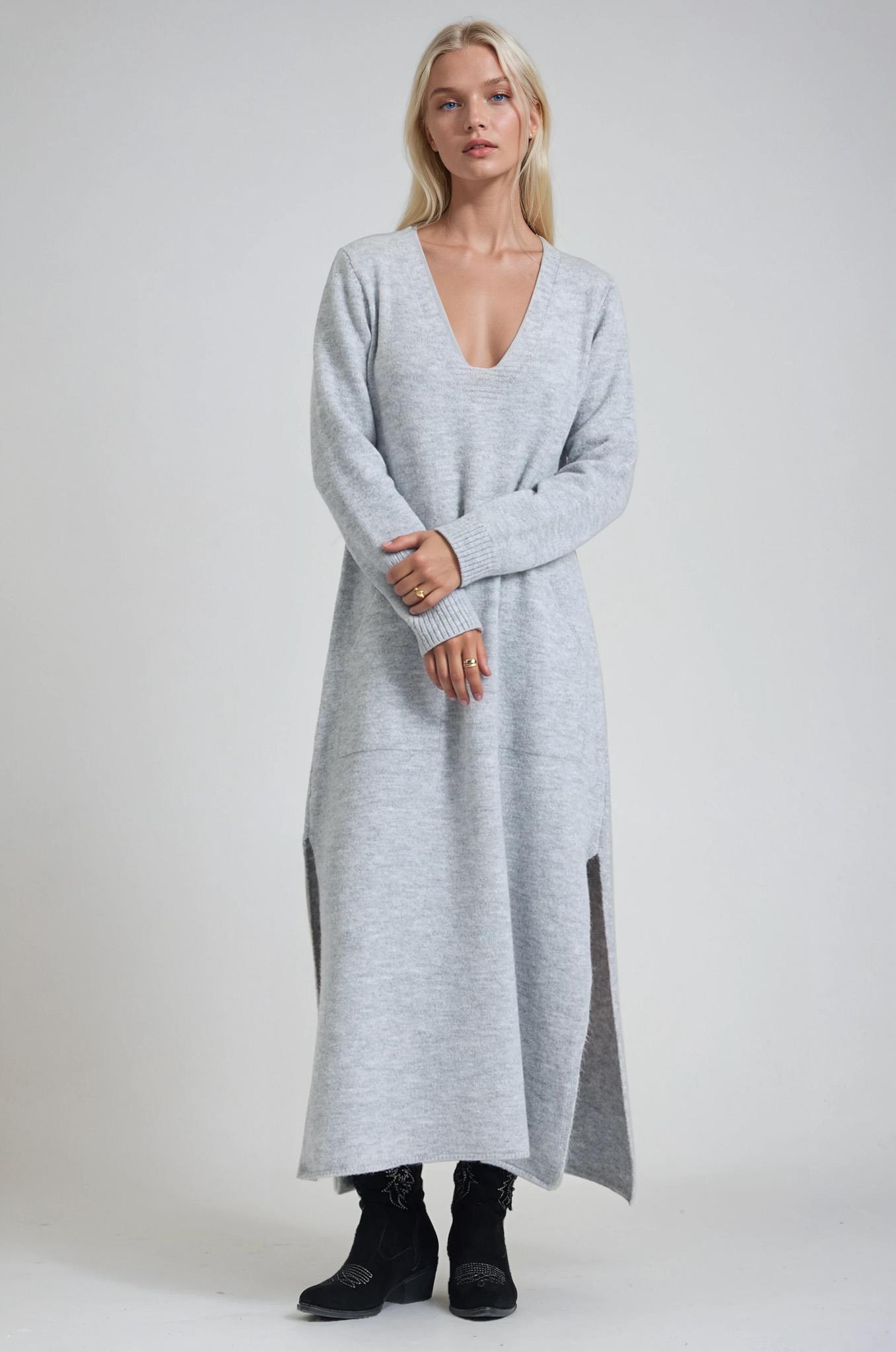 V Yaka Yan Yırtmaçlı Triko Maxi Elbise 2019